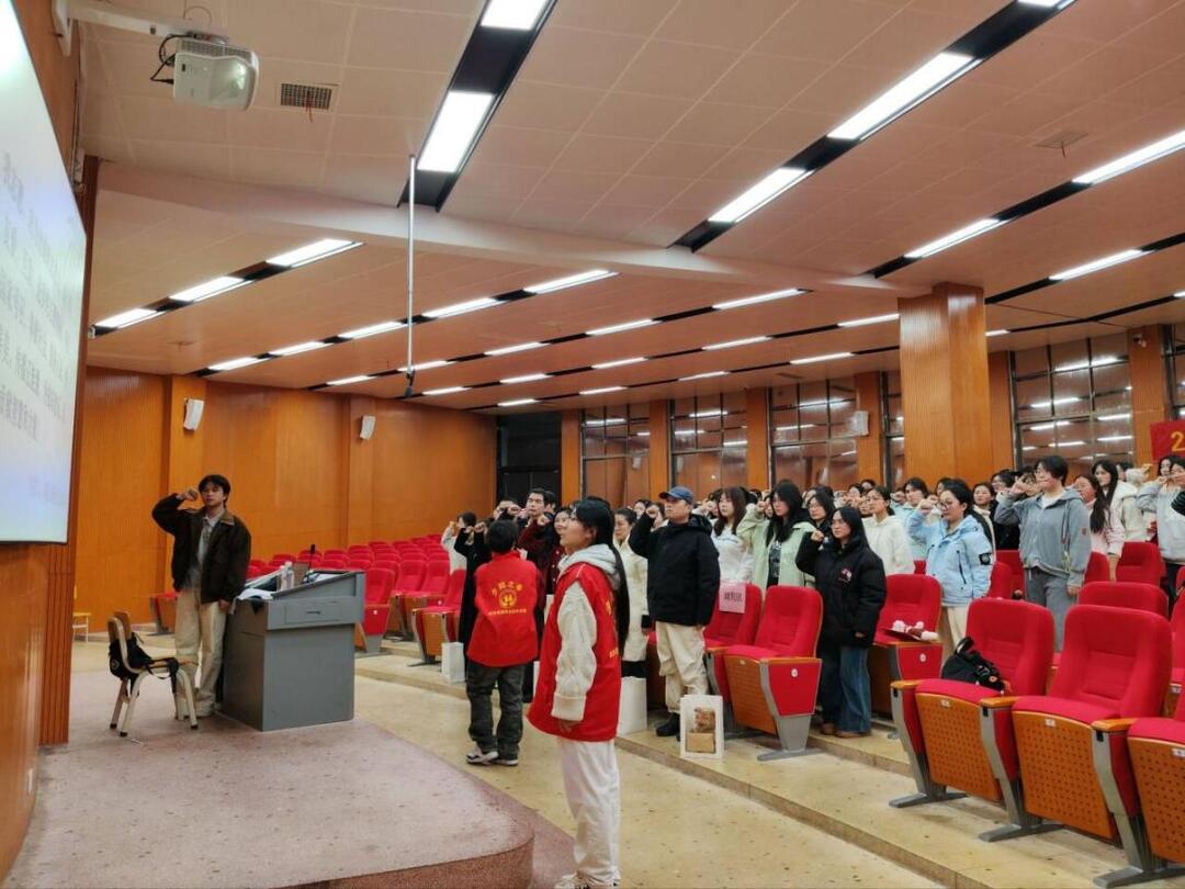 表彰环节是本次大会的核心亮点。现场先后为香樟路社区、莱康、理程康养等多个社区、机构的优秀志愿者颁发各项荣誉。其中,李佳钰等10名同学获“夕阳之春优秀志愿者”称号,房雅诗等10名同学获“夕阳之春十佳志愿者”称号,王文静怡等10名同学获“志愿汇金辉项目优秀志愿者”称号。嘉宾们为获奖志愿者颁奖并寄语,分享养老行业经验,鼓励同学们坚守志愿初心,在服务中提升自我。老服2533班吴曼绮作为新生代表发言,表达了传承志愿精神的坚定决心。随后,全体成员在老服2432班李洁媛的带领下重温志愿者誓言,铿锵誓言彰显初心使命。